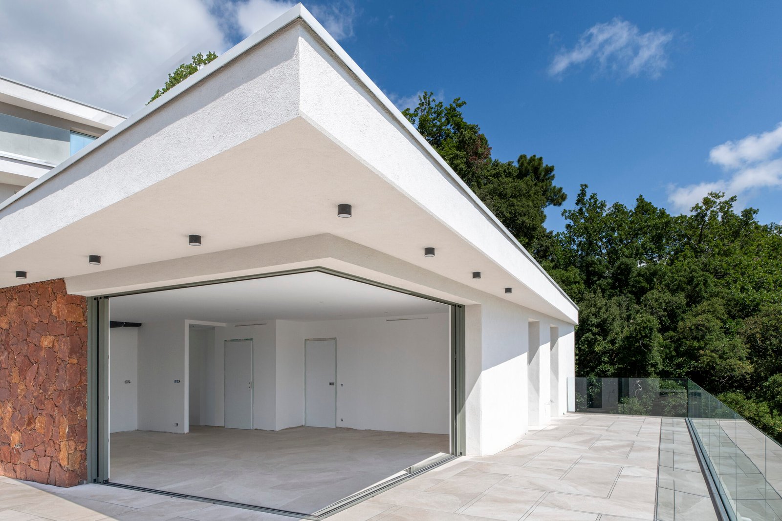 The large sliding doors open fully and are fitted with burglar-resistant double glazing with a reflective filter, providing both sun protection and true interior privacy.